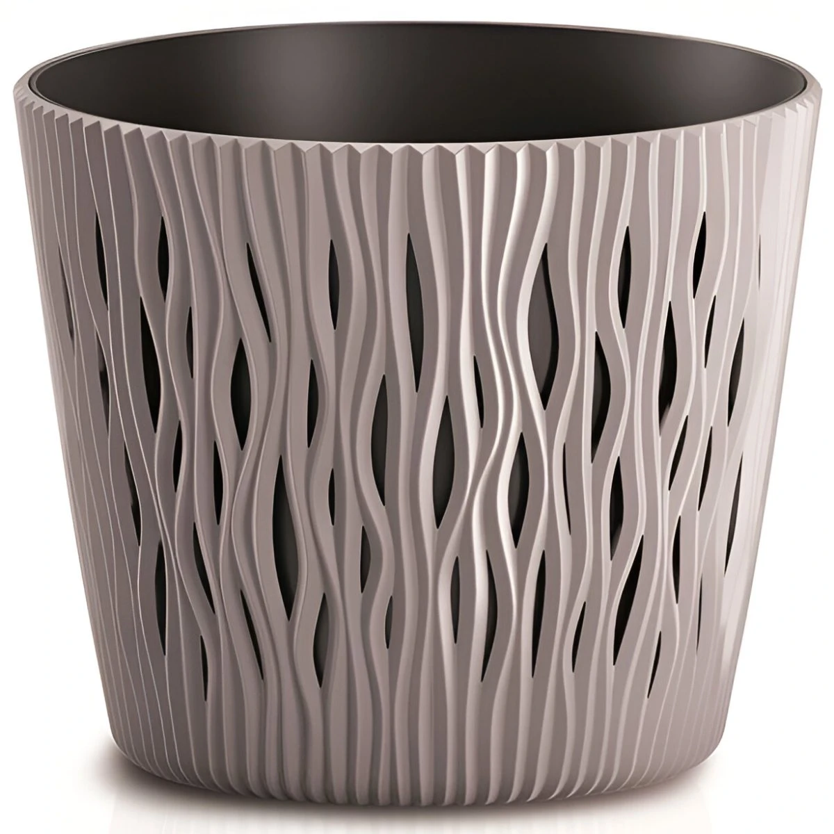 Puķu pods Sandy Round brūnā krāsā. Puķu pods izgatavots no kvalitatīvas plastmasas, tas ir viegls un vienlaikus izturīgs. Puķu poda unikālo dizainu veido ar izgriezumiem dekorēts matēts ārējais puķu pods un melnais ieliktnis. Puķu pods ir UV un sala izturīgs. Izmērs (D x A) 19 x 16 cm.