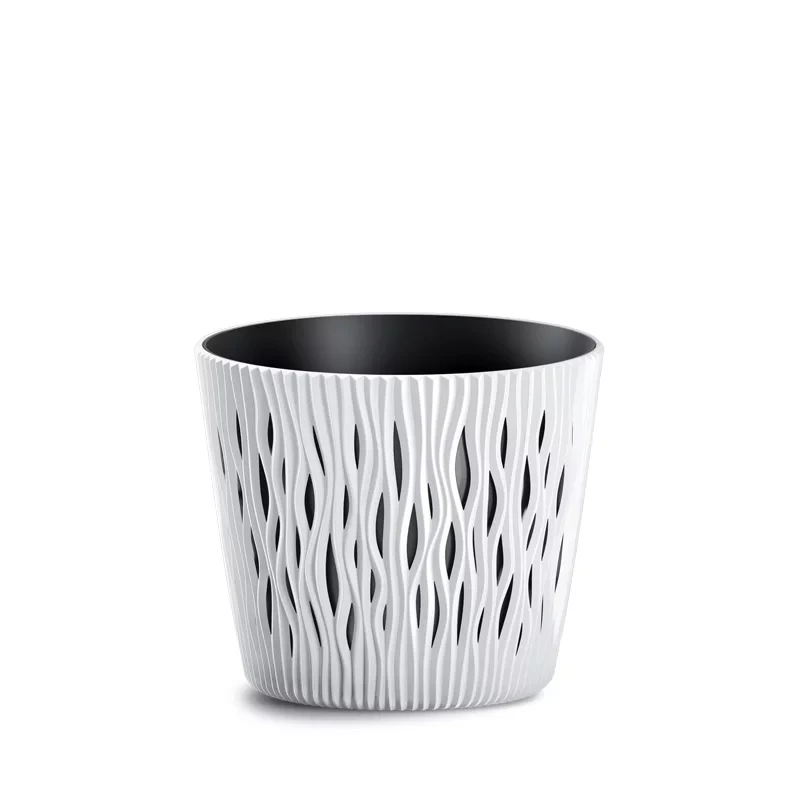 Puķu pods Sandy Round baltā krāsā. Puķu pods izgatavots no kvalitatīvas plastmasas, tas ir viegls un vienlaikus izturīgs. Puķu poda unikālo dizainu veido ar izgriezumiem dekorēts matēts ārējais puķu pods un melnais ieliktnis. Puķu pods ir UV un sala izturīgs. Izmērs (D x A) 19 x 16 cm.