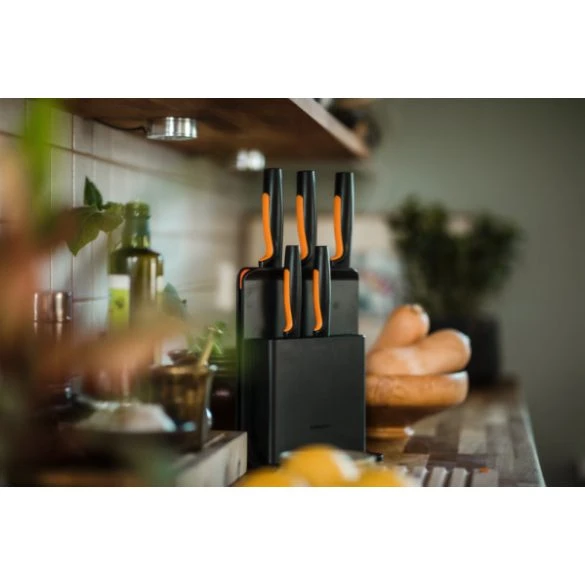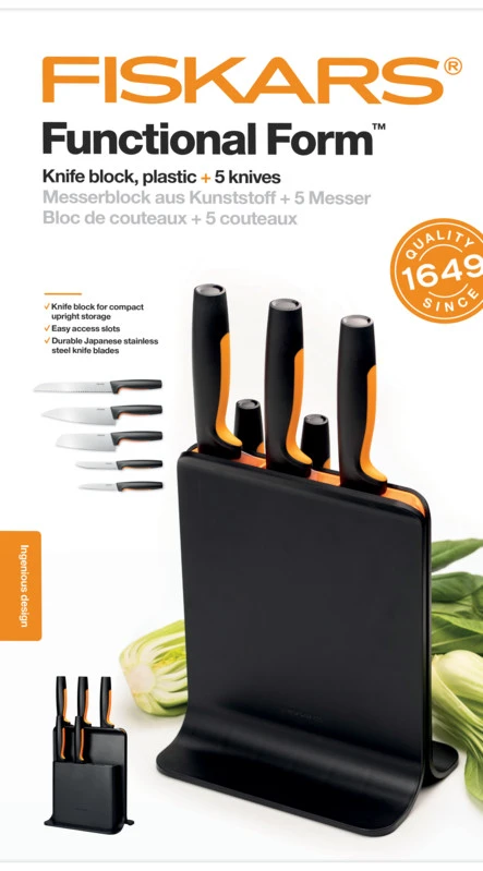 Elegants, mūsdienīgs plastmasas statīvs, kas ideāli piemērots drošai un ērtai nažu glabāšanai. Komplektā ietilpst dārzeņu nazis, tomātu nazis, maizes nazis, santoku nazis un šefpavāra nazis; <br /> Izturīgs statīvs ar papildus vietu šķērēm vai nazim, <br /> Augstas kvalitātes japāņu nerūsējošais tērauds nodrošina izcilu asumu un izturību pret koroziju; <br /> Drošs neslīdošs rokturis ar Softouch materiālu; <br /> Ergonomisks rokturis; <br /> Stenda izmēri: 25 x 20 x 13,5 cm.