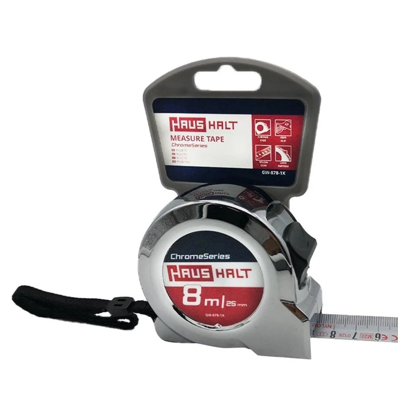 Zīmols- Haushalt. Artikuls- GW-878-1X. Garums- 8 m. Lentas platums- 25 mm. Lentas materiāls- Neilons. Precizitātes klase- 2. Mērogs- 1 mm. Ar rokturi- Nē. Klasificēts- Centimetri, Metri, Milimetri. Ar fiksatoriem- Jā. Magnētiskais gals- Jā.
