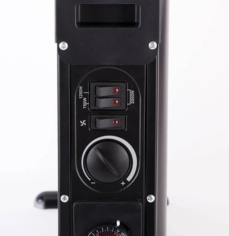 Sildiet ar konvekciju Turbo funkcijas slēdzis 2 gaismas slēdži. 3 sildīšanas jaudas: 750 W - 1,250 W - 2000 W Regulējams vides termostats Pārkaršanas drošības ierīce Nav smakas Klusa Transportēšanas rokturi Izmēri: 57 x 20 x 42 cm Spriegums 230 V Jauda 2.000 W
