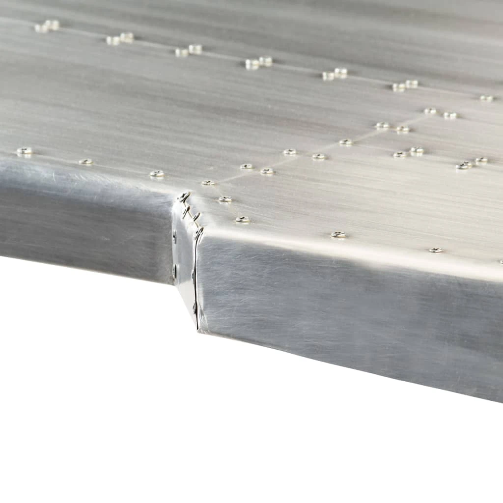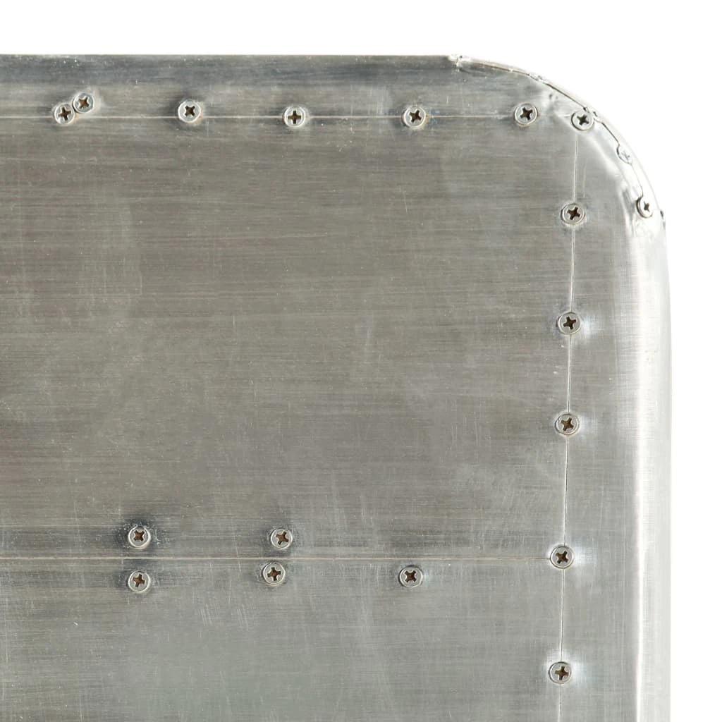 Aviācijas stila galds ir izgatavots no mango masīvkoka. Tā virsma ir veidota no pulēta alumīnija plāksnēm, kas akcentētas ar redzamām tērauda skrūvēm, padarot galdu īpaši izturīgu. Misiņa krāsas tērauda kājas un kniežu raksts piešķir šim aviācijas stila galdam industriālu šarmu. Tam ir liela virsma, uz kuras ir daudz vietas jūsu mapju, dokumentu, grāmatu vai citu mantu novietošanai.
