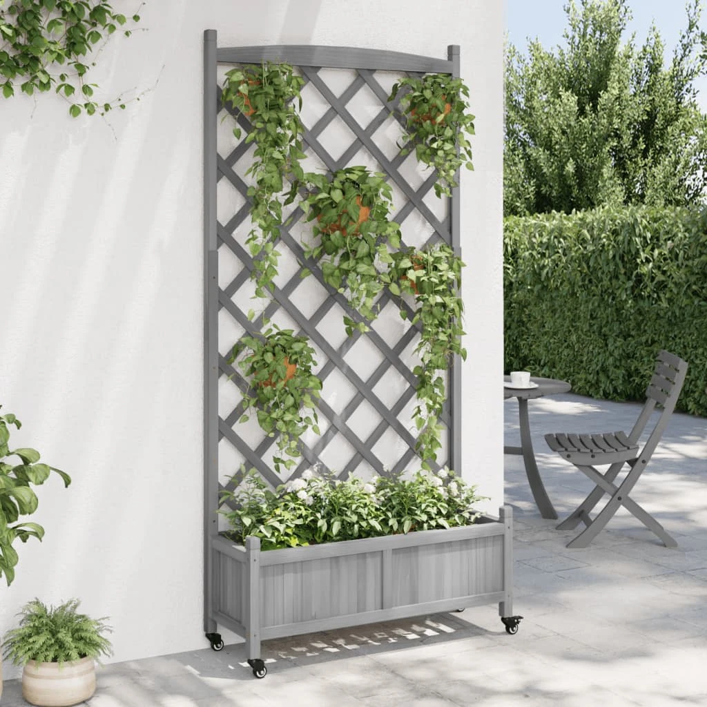 Šī koka puķu kaste ar špaleru un ritenīšiem ir piemērota vīteņaugiem. To var novietot dārzā vai uz terases.