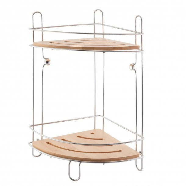 Praktisks stūra plaukts ar 2 plauktiem. Stiprinās pie sienas ar skrūvēm (iekļautas komplektā). Plaukti izgatavoti no ilgtspējīga, strauji augoša bambusa, ar dabisku, pievilcīgi graudainu izskatu, rāmis no hromēta metāl. Izmērs 19.5 x 36.5 x 19.5 cm, maksimālā slodze 8 kg.