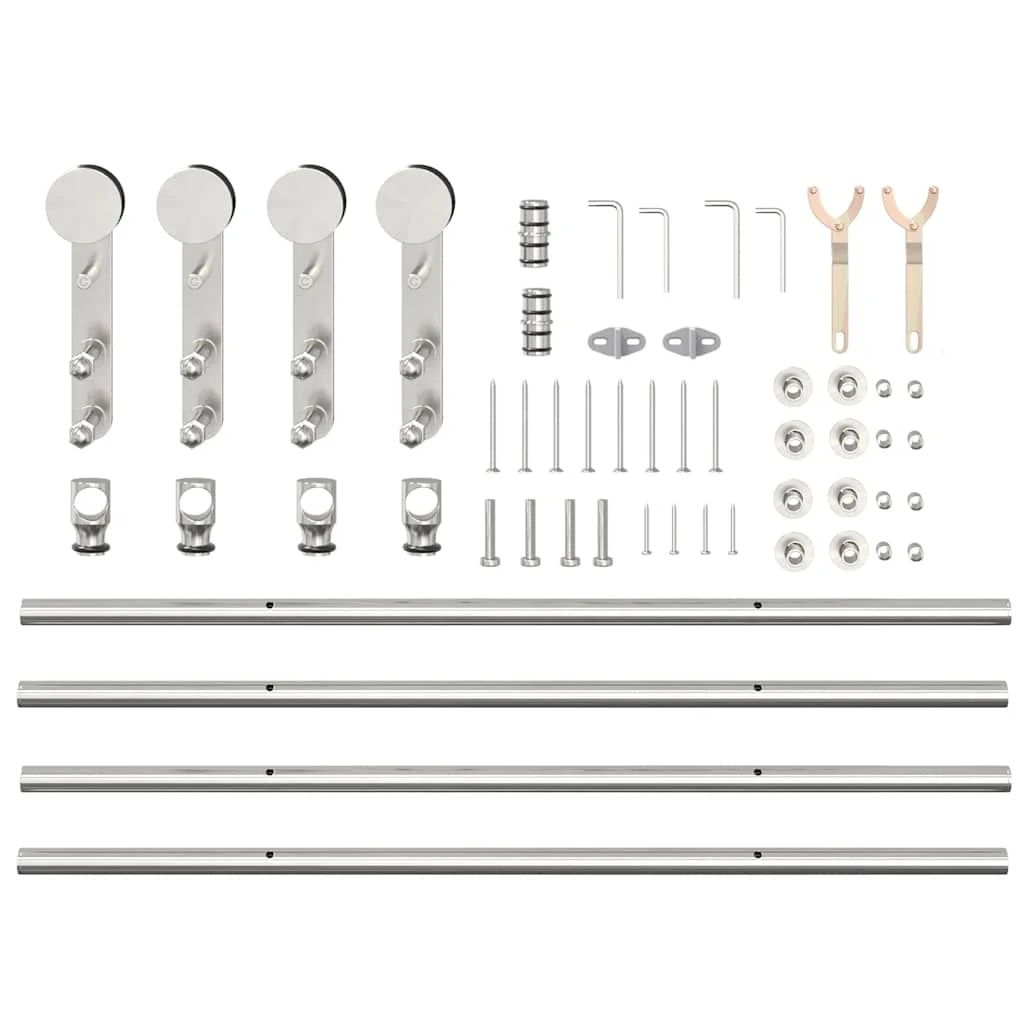Izmantojot šo bīdāmo durvju aparatūras komplektu, varat viegli iestatīt dubultās sliedes, lai durvju pāris varētu slīdēt viena otrai priekšā un aiz muguras.