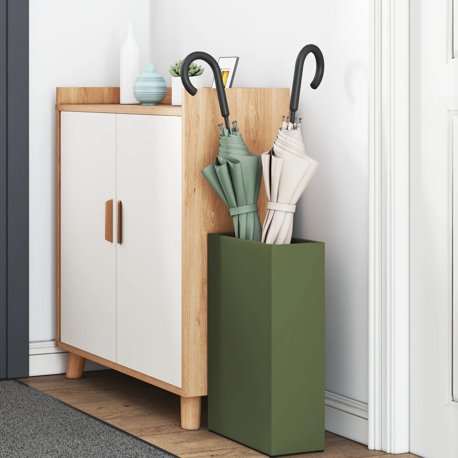 • Ieteicamais lietojums: Paredzēts lielākoties iekštelpām, šis lietussargu turētājs ir ideāls foajēs, gaiteņos vai pat birojos. Minimālisma stils papildina mūsdienu dekoru un novērš haosu, padarot to ideāli piemērotu kārtīgām vidēm.