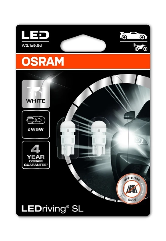 Zīmols- Osram. Artikuls- 2825DWP-2BL. Spuldzītes tips- LED. Spuldzes veids saskaņā ar ECE- W5W. Spriegums- 12 V. Krāsa- Balta. Cokols- W2.1x9.5d. Spuldzītes jauda- 1 W. Krāsas temperatūra- 6000 - 6700°K. Gaismas plūsma (±15%)- 50 lm. Vidējais nominālais ekspluatācijas laiks- 5000 h. Vienību skaits iepakojumā- 2. Garums- 26.8 mm. Platums- 10 mm. Papildus informācija- Krāsas temperatūra: 6000 K.