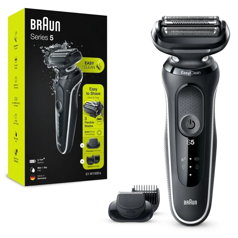“Braun” 5. sērijas 51-W1500s elektriskais skuveklis ar bārdas trimmeri, sausai un slapjai skūšanai, uzlādējams, bezvadu skuveklis ar sietiņu, baltā krāsā