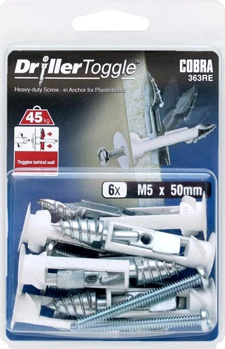 Zīmols- Cobra. Opciju tips- Paredzēts GK plāksnēm. Garums- 63 mm. Diametrs- 11.5 mm. Stiprinājuma veids- Skrūves. Opciju materiāls- Neilons, Metāla. Vienību skaits iepakojumā- 6.