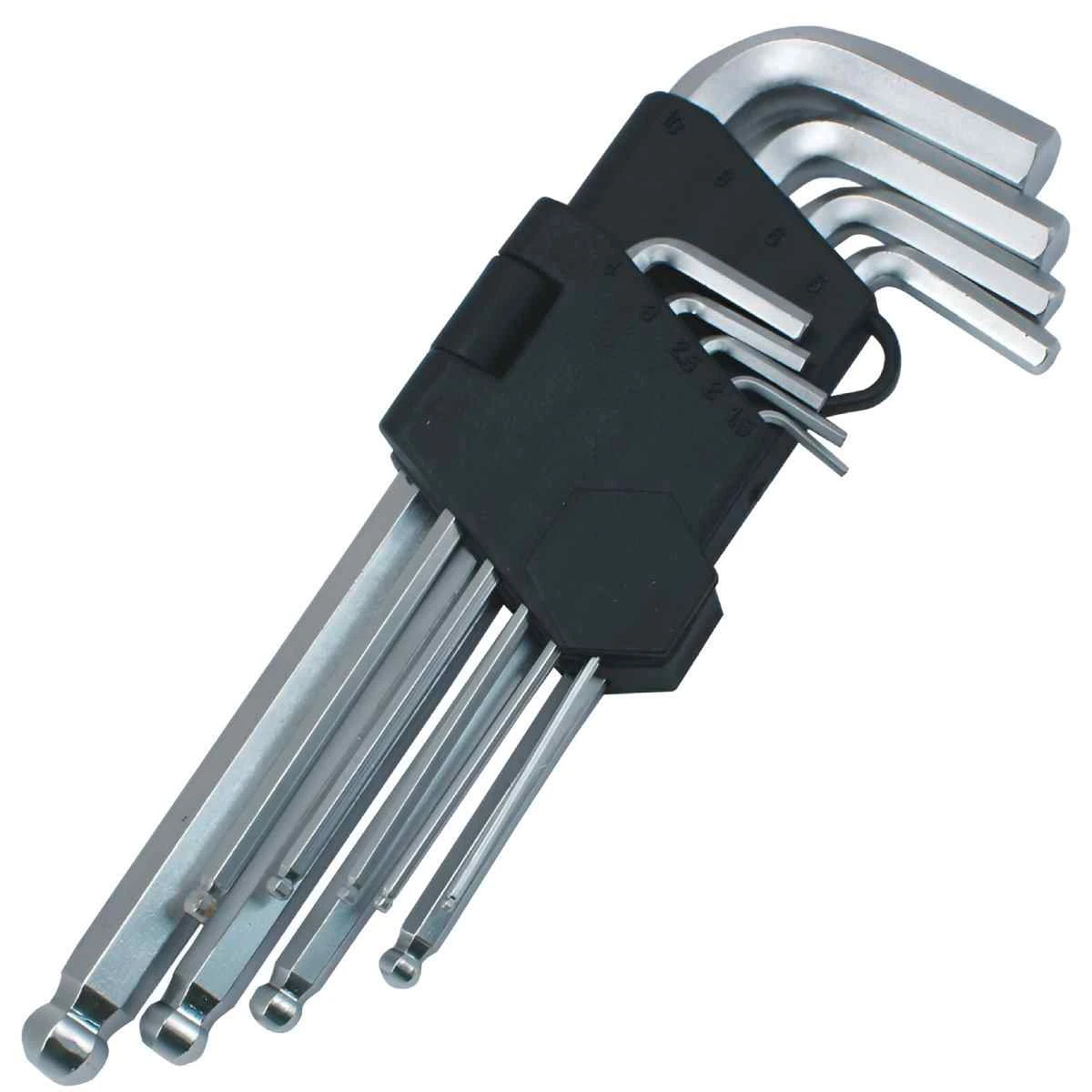 Seškanšu atslēgas ar sfēriskiem galiem. Izgatavotsa no izturīga hroma vanādija sakausējuma. Ievietotas praktiskā, cietā, plastmasas turētājā ar izmēra marķējumu. Atslēgu garums no 80 līdz 220 mm.