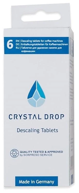 Zīmols- Crystal Drop. Artikuls- 80003. Vienību skaits iepakojumā- 6. Obligātā garantija- 24 mēn. Papildus informācija- 3 cikli (3 kalcifikācijas x 2 tabletes). Piemērots automātiskajiem kafijas automātiem Bosch, Jura, DeLonghi, Krups, Melitta, Miele, Nivona, Siemens, WMF u.c..