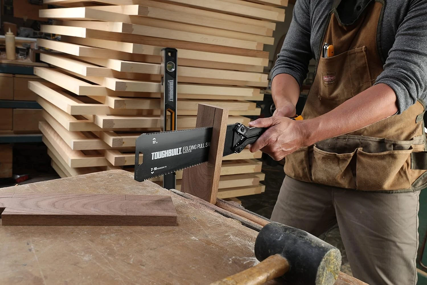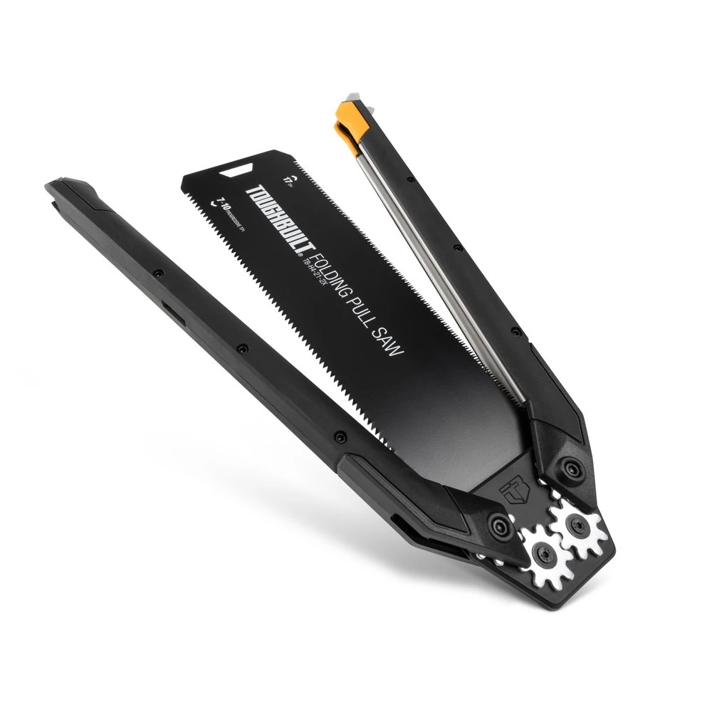 ToughBuilt saliekamais zāģis ar patentētu dizainu integrē asmens uzglabāšanu zāģa rokturī, nodrošinot lietotājam pilna garuma vilkšanas zāģi un kompaktu uzglabāšanu. Injekcijas veidots rokturis piedāvā maksimālu komfortu un kontroli lietotājam. Tērauda apakšstruktūra palielina izturību un stingrību, nodrošinot taisnākus griezumus ar mazāku piepūli. Dubultas asmens malas ar 17 TPI malu un progresīvu 7 līdz 10 TPI malu sniedz lietotājam dažādas griezuma apdares iespējas.