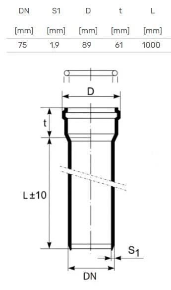 Zīmols- Magnaplast. Diametrs- 75 mm. Santehniskais savienojums. diametrs- 75 mm – Uzmavas gals. 75 mm – Gluds gals. Sieniņas biezums- 1.9 mm. Garums- 1 m. Trokšņa līmenis- 26 dB. Materiāls- Polipropilēns (PP). Maksimālā pastāvīgo notekūdeņu temperatūra- 90 °C. Krāsa- Pelēka. Papildus informācija- Materiāls: Polipropilēns. Diametrs: 0.75 mm. Krāsa: Pelēka. Paredzētas lietošanai- Iekštelpu kanalizācijai.