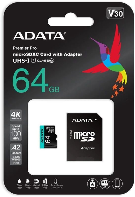 Zīmols- Adata. Atmiņas kartes tips- Micro SD. Atmiņas ietilpība- 64 GB. Atmiņas kartes klase un ātrums- UHS-I Class 10 (max. 80MB/s). Īpaša aizsardzība- Ūdensnecaurlaidīgs. Triecienizturīgs. Komplektā ietilpst adapteris- SD. Obligātā garantija- 24 mēn. Garantija juridiskām personām- 12 mēn.