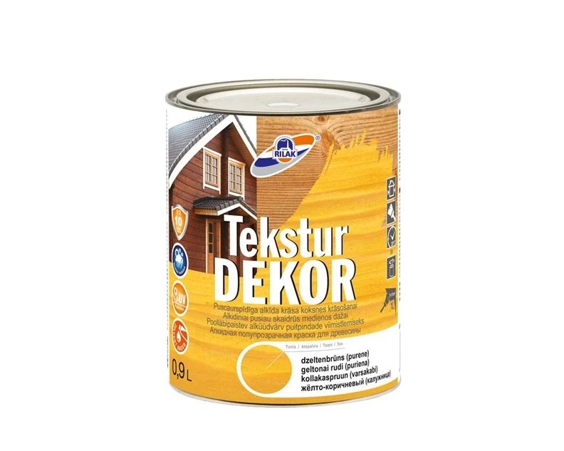Zīmols- Rilak. Apdares darbiem- Āra. Iepakojuma daudzums. l- 0.9. Atšķaidītājs- Neatšķaidīt. Krāsa- Brūna. Patēriņš- 9-11 m²/l. Īpašības- Saglabā koksnes tekstūru. neveidojot uz virsmas necaurlaidīgu plēvi.. Pilnīgi sausa pēc- 8 - 8h. Žūšanas laiks (pirms pieskaršanās)- 8 - 8h.