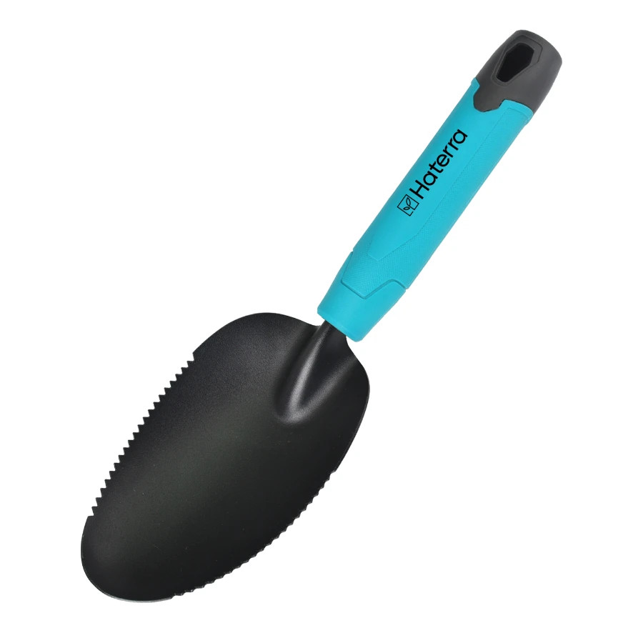 Kompakta dārza lāpstiņa Haterra ar ergonomisku rokturi ir ideāli piemērota stādīšanas un ravēšanas darbiem. Izgatavota no izturīga oglekļa tērauda ar matētu melnu pārklājumu, kas nodrošina papildu aizsardzību pret koroziju. Ergonomiskais PP (polipropilēna) rokturis ar īpašu formu nodrošina ērtu satvērienu un precīzu kontroli darba laikā. Robiņi gar lāpstiņas malām atvieglo augsnes irdināšanu un nezāļu izraušanu. Kompaktais izmērs un vieglais svars padara to par ideālu instrumentu stādīšanai, pārstādīšanai un darbam ar puķu podiem. Praktiskā cilpiņa roktura galā nodrošina ērtu uzglabāšanu.