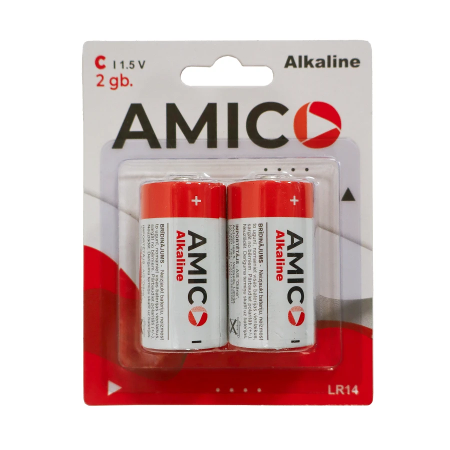 Uzticamas un jaudīgas AMICO C tipa sārma baterijas ideāli piemērotas ierīcēm ar lielāku enerģijas patēriņu - piemēram, portatīvajiem radio, lukturīšiem vai rotaļlietām. Baterijas nesatur dzīvsudrabu un kadmiju, padarot tās videi draudzīgākas. Alumīnija folijas pārklājums nodrošina papildu aizsardzību pret bojājumiem. Ilgstošai lietošanai - nepārtrauktas izlādes laiks pārsniedz 18 stundas. Komplektā 2 gb.