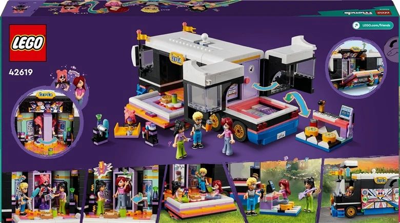 Produkta veids- Konstruktori. Zīmols- LEGO®. Artikuls- 42619. Kolekcija- Friends. Materiāls- Plastmasa. Modelis- Pop Star Music Tour Bus. Brīdinājums par rotaļlietām- Nav piemērots bērniem, kas jaunāki par trim gadiem.. Ieteicamais vecums no- 8. g..