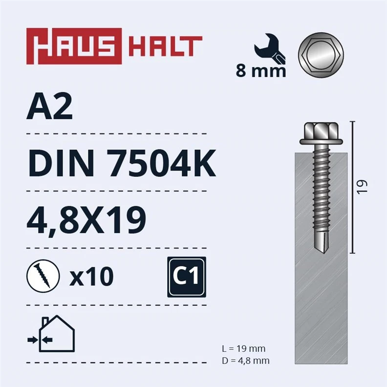 Zīmols- Haushalt. Pašskrūvējošais tips- Ar uzgriezni. Garums- 19 mm. Diametrs- 4.8 mm. Pārklājums- Nerūsējošā tērauda. Iespējamais materiāls- Metāls. Standarta- DIN 7504K. Vienību skaits iepakojumā- 10. Papildus informācija- Garums: 19 mm. Diametrs: 4.8 mm. Pārklājums: Nerūsējošā tērauda. Iespējamais materiāls: Metāls.