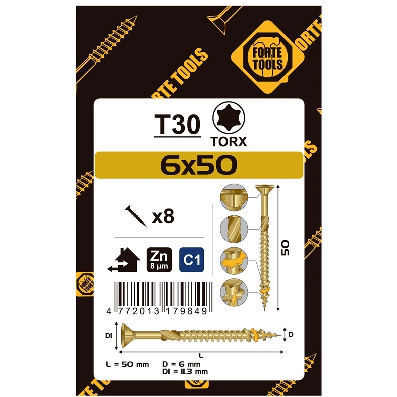 Preču zīmols- Forte Tools. Koksnes skrūvju tips- Universālie. Galvas tips- Iegremdējama. Pārklājums- Cinkots. Krāsa- Dzeltena. Garums- 50 mm. Diametrs- 6 mm. Galvas iegriezuma tips- Torx. Vienības iepakojumā- 8.