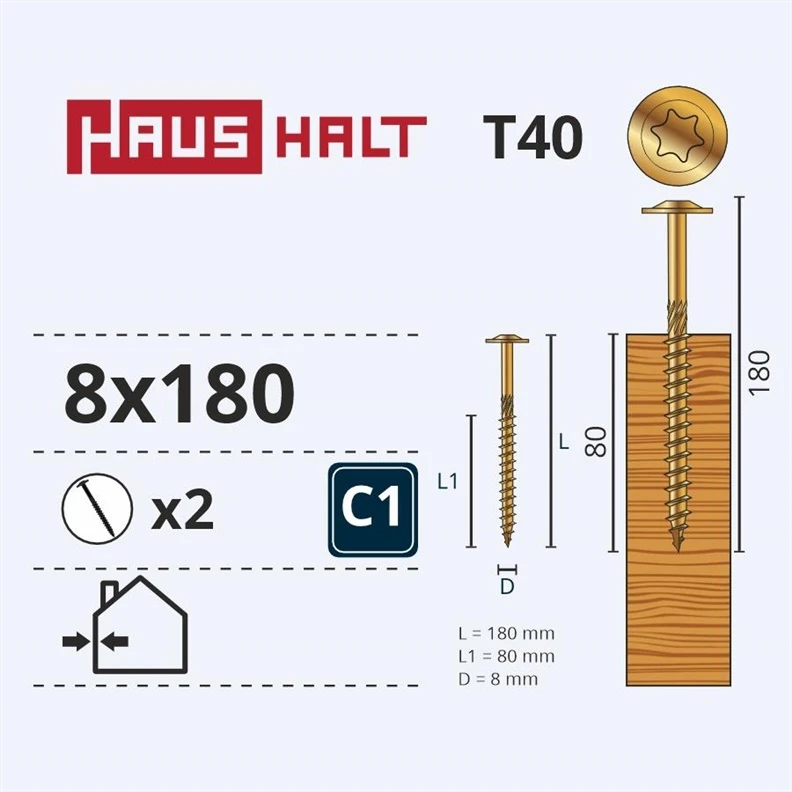 Zīmols- Haushalt. Skrūves tips- Skrūves kokam. Galvas tips- Pusapaļā. Pārklājums- Cinkots. Krāsa- Dzeltena. Garums- 180 mm. Diametrs- 8 mm. Galvas formas tips- Torx. Vienību skaits iepakojumā- 2.
