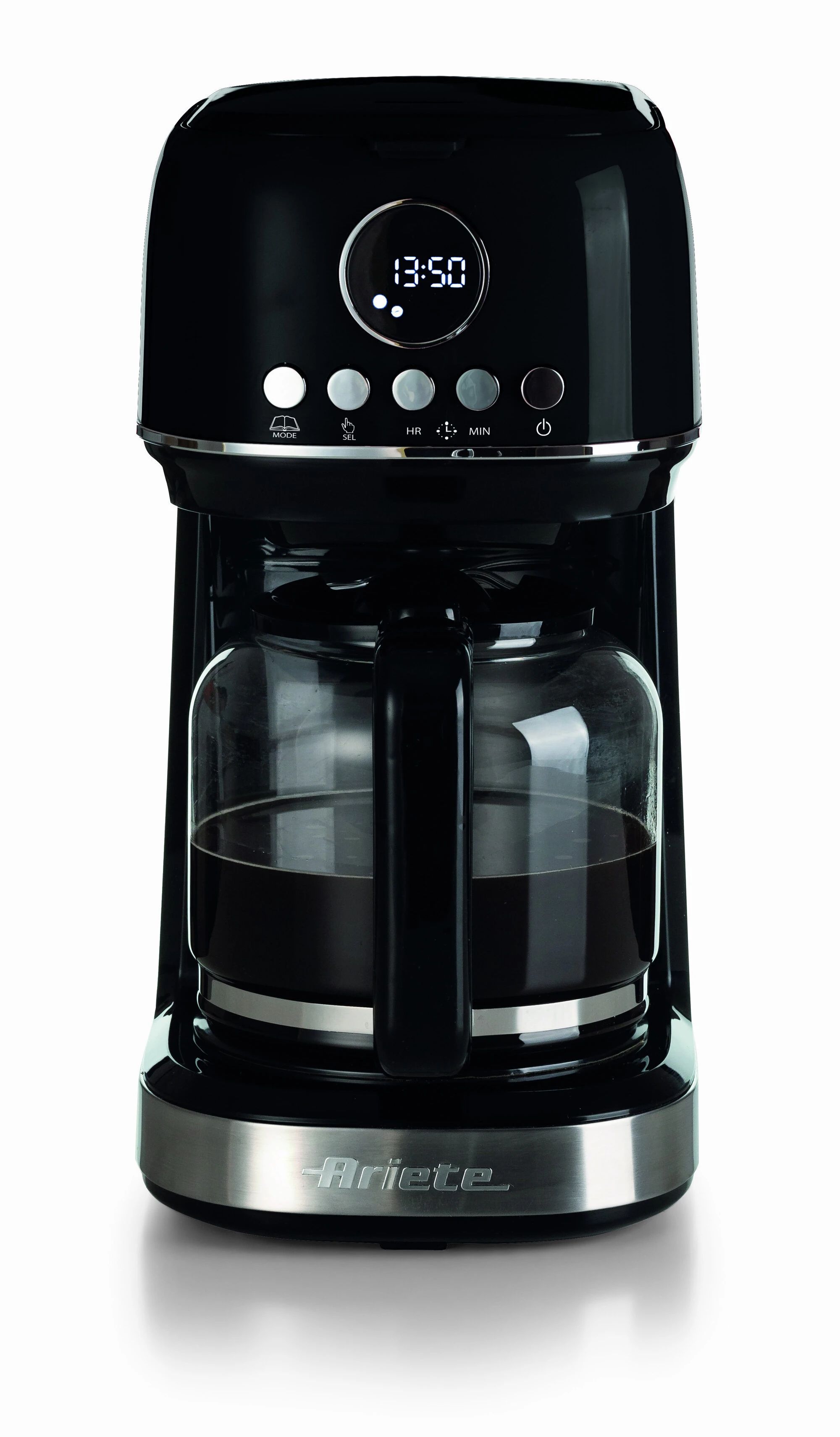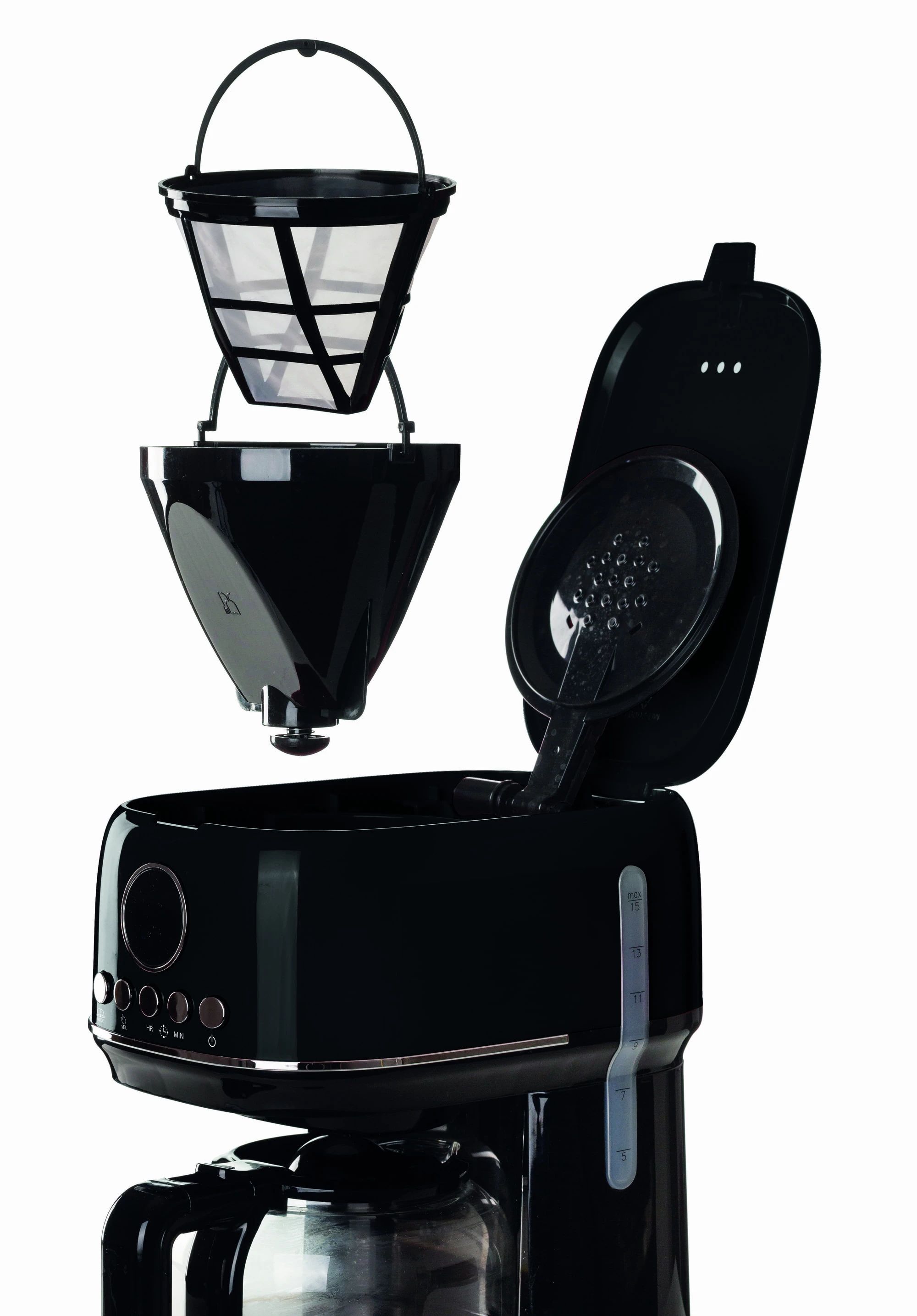 Filtrēšanas kafijas automāts amerikāņu stilā. Iestatiet kafijas pagatavošanu, izmantojot LCD ekrānu, un gaidiet, līdz kafija būs gatava. Pateicoties sildīšanas plāksnei, jūsu kafija paliek silta līdz pasniegšanai. Vienā reizē var pagatavot līdz 15 tasēm kafijas, pateicoties rūdītā stikla kannas lielajai ietilpībai. Ūdens līmenis ir redzams. Filtra turētājs un filtrs ir viegli mazgājami.