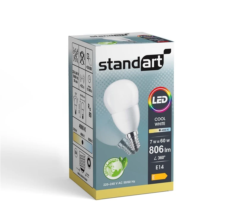 Produkta veids- Lampiņas. Artikuls- 4772013281207. Zīmols- Standart. Spuldzītes tips- Integrētā LED spuldze. Garums- 95 - 95mm. Platums- 48 - 48mm. Augstums- 48 - 48mm. Spriegums- 220 - 240V. Cokols- E14. Gaismas plūsma- 806 - 806lm. Spuldzītes forma- Apļveida/burbulis. Apgaismojuma krāsa- Neitrāli balta. Krāsas temperatūra- 4000 - 4000°K. Virsmas/stikla veids- Matēts. Lampas apgaismojuma regulators- Nē. Spuldzītes apzīmējums- P48. Krāsu atveidošanas indekss (CRI)- 80. Energoefektivitātes klase- E. Enerģijas patēriņš, kWh/1000 h- 7. Vidējais nominālais ekspluatācijas laiks- 15000 h. Obligātā garantija- 24 mēn. Garantija juridiskām personām- 12 mēn.