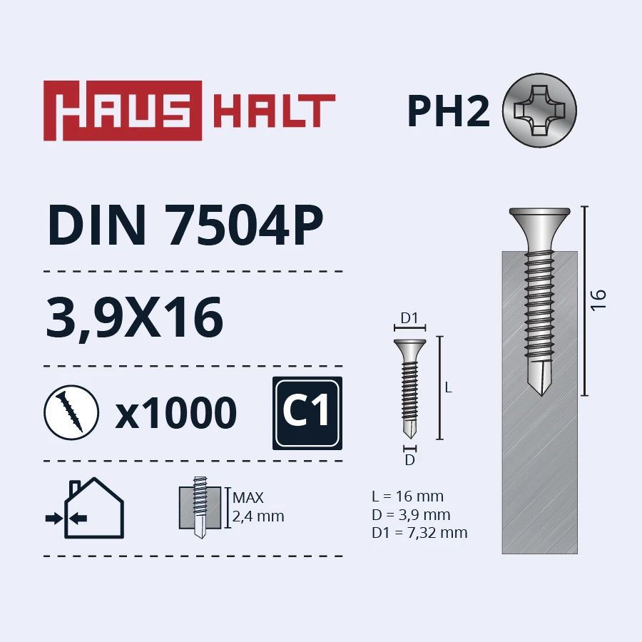 Zīmols- Haushalt. Artikuls- DIN 7504P. Pašskrūvējošais tips- Ar uzgriezni. Garums- 16 mm. Diametrs- 3.9 mm. Pārklājums- Cinkots. Iespējamais materiāls- Metāls. Standarta- DIN 7504P. Vienību skaits iepakojumā- 1000.