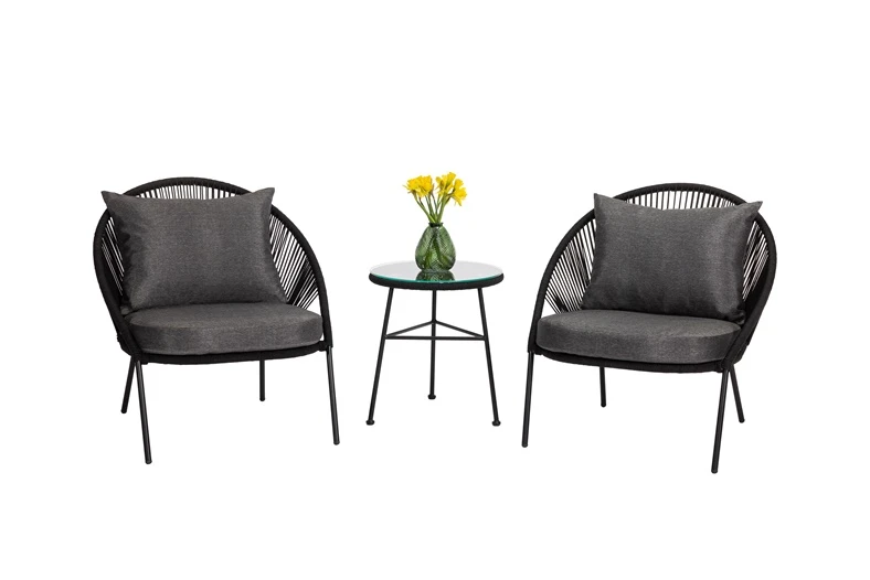 Zīmols- Domoletti. Sēdvietu skaits komplektā- 2 - 2. Galda garums- 51 - 51cm. Galda augstums- 45 - 45cm. Galda platums- 51 cm. Virsmas materiāls- Rūdītā stikla. Salokāms galds- Nē. Ar lietussarga caurumu- Nē. Atzveltnes krēsla augstums- 78 cm. Krēsla garums- 81 cm. Krēsla platums- 73 cm. Ar roku balstiem- Nē. Saliekamais krēsls- Nē. Mēbeles rāmja materiāls- Tērauds. Apdares materiāls- Virve. Mēbeļu komplekta krāsa- Melns. Āra mēbeļu komplekta daļas- 2 krēsli, 1 kafijas galdiņš. Mēbeļu spilveni iekļauti komplektā- Jā. Mēbeļu spilvenu pildījums- Putas. Mēbeļu spilvenu pārvalks- Poliesters. Obligātā garantija- 24 mēn.