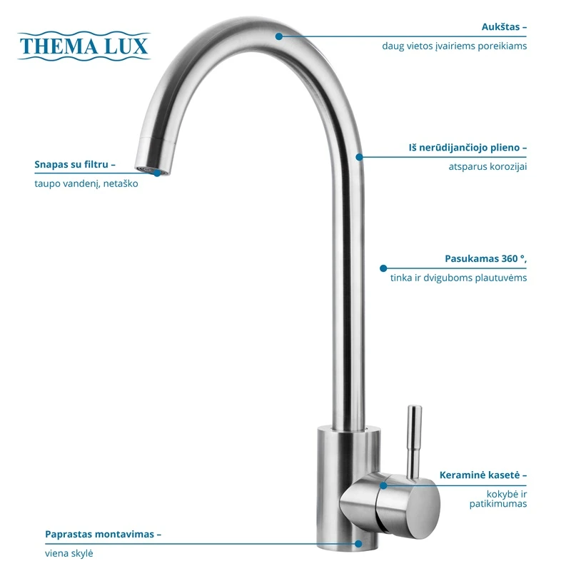 Zīmols- Thema Lux. Modelis- L-4087. Montāžas tips- Stiprināms uz virsmas. Garums- 23 cm. Platums- 5 cm. Svars- 1.3 kg. Augstums- 37 cm. Krāsa- Pelēka. Materiāls- Nerūsējošais tērauds. Savienotājs- 3/8 collu. Kārtridžs/sajaukšanas sistēma (kārtridžs)- 3.5 cm. Caurplūdes koeficients- 8 l/min. Rokturu skaits- 1. Izvelkamas galvas- Nē. Elastīgas galvas- Nē. Obligātā garantija- 24 mēn. Komplekts- Savienojuma šļūtenes 3/8.. Papildus informācija- Knābja garums 21 cm..
