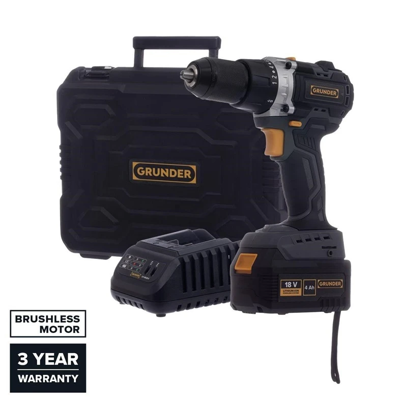 Maksimālais griezes moments, Nm- 85. Apgriezienu skaits tukšgaitā- 0-2000, 0-550. Elektriskā dzinēja tips- Bezsuku. Obligātā garantija- 24 mēn. Āmura režīmi- Nē. Ātrumu skaits- 2. Zīmols- Grunder. Artikuls- CD-B0718. Svars- 3.8 kg. Stobra diametrs- 13 mm. Griezes momenta soļu skaits- 19. Maks. urbšanas diametrs kokā- 40 mm. Maks. urbšanas diametrs tēraudā- 13 mm. Akumulators iekļauts komplektā- Jā. Akumulatora tips- Li-ion. Akumulatoru skaits komplektā- 1. Nepieciešamais akumulatoru skaits- 1. Akumulatora spriegums- 18 - 18V. Lādētājs iekļauts- Jā. Soma komplektā- Jā. Uzlādes līmeņa indikators- Jā. Uzgaļu komplekts iekļauts- Nē. Iebūvēts LED apgaismojums- Jā.