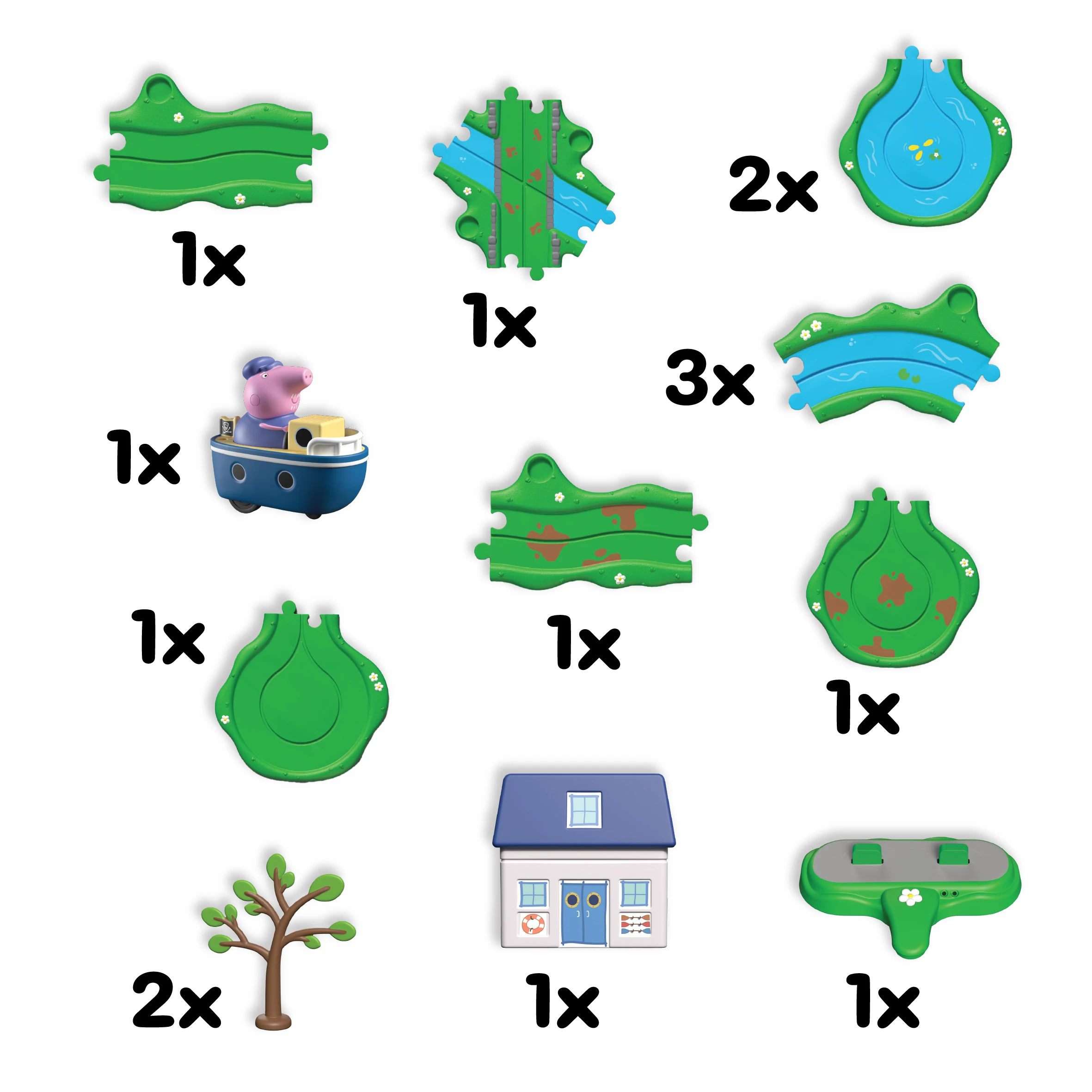 2 ceļa posmi, 3 upes posmi, 1 krustojums, 2 upes līkumi, 2 ceļa līkumi, 1 Vējainais pils, 2 koki, 1 vectēva Cūciņas laiva, 1 laivu māja, 1 elektroniskā bāze