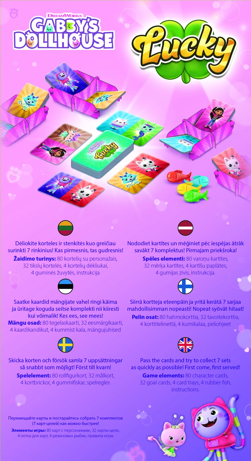 LUCKY ir traka, ātra uztveres spēle, kurā ikviens centīsies paķert atklātās sapņu kartītes! Izdaliet visas kartītes spēlētājiem un ievietojiet turētājos. Paņemiet rokās piecas kārtis un atklājiet sapņu kartītes. Kopš tā brīža jūs vienlaikus mēģināt nomainīt savas kartītes, ievietojot tās atpakaļ paliktnī kreisajā pusē. Tajā pašā laikā jūs ņemat jaunas kartītes no labajā pusē esošā paliktņa, līdz jūsu rokā ir divas kartītes, kas atbilst attēlam uz vienas no kaķa sapņu kartītēm.
