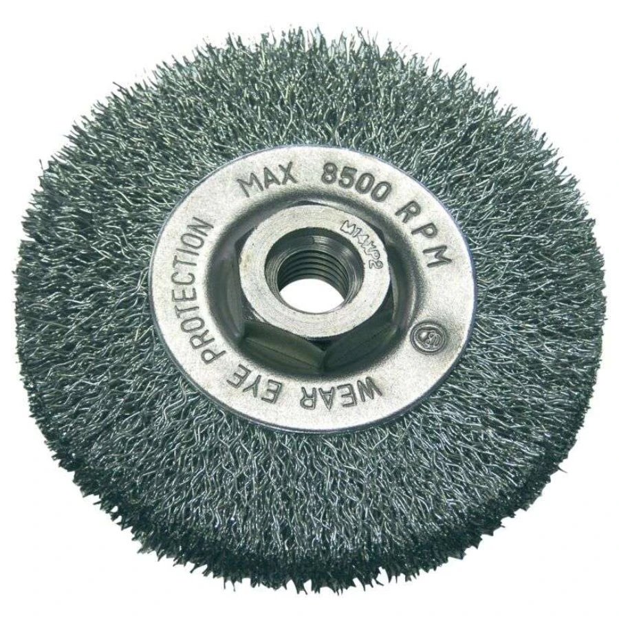 Diskveida birste ar tērauda sariem un M14 centra vītni. Izmantošanai ar leņķa slīpmašīnu. Piemērota viegliem un vidēji smagiem darbiem, piemēram, krāsas, rūsas noņemšanai. Birstes diametrs 100 mm. Maksimālais ātrums 8500 apg./min.