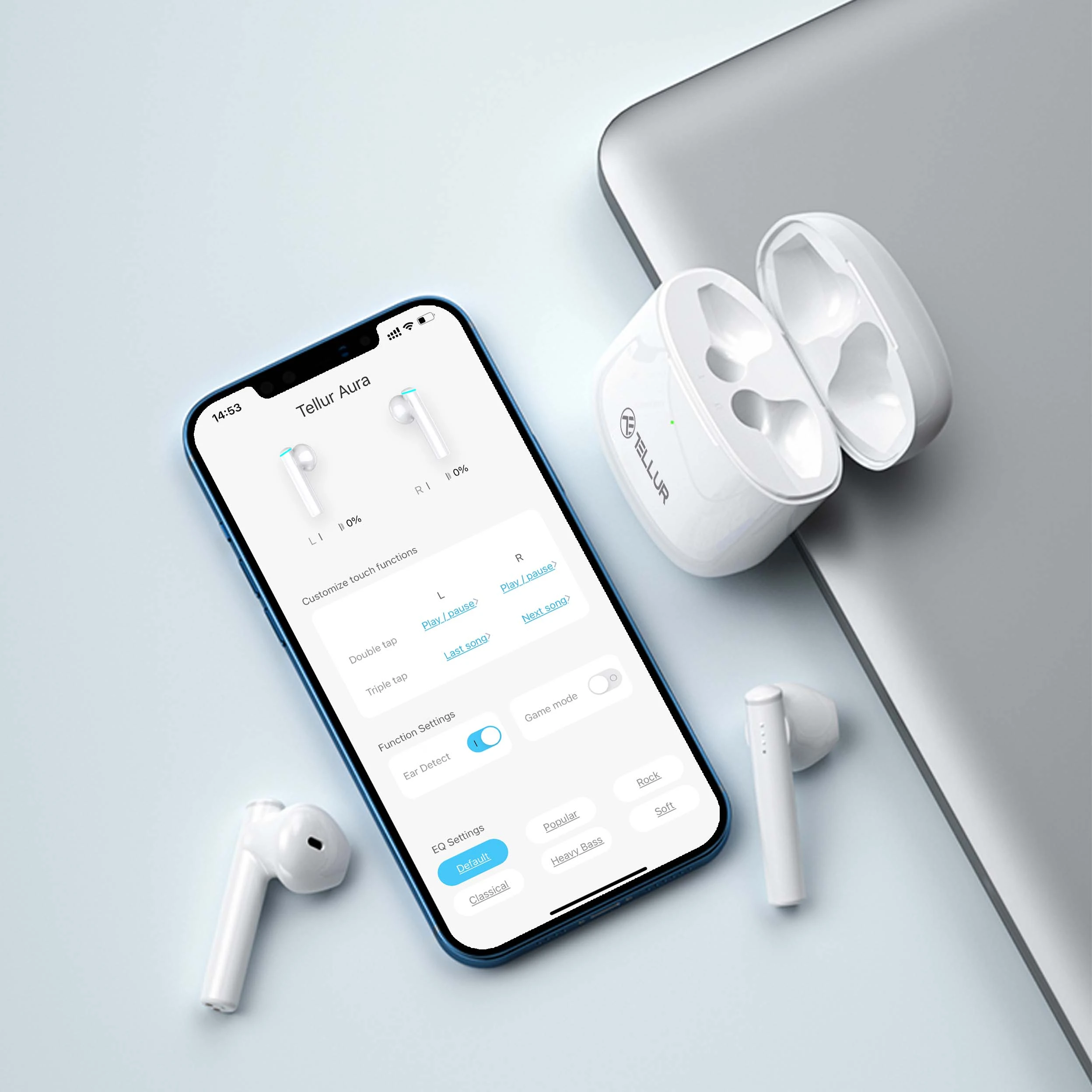 Lietojumprogrammas funkcijas: ekvalaizera iestatījumi, Divkāršā/trīskāršā pieskāriena funkcijas maiņa, Auss noteikšana un spēles režīma ieslēgšana/izslēgšana, Austiņu atrašana, programmaparatūras jaunināšana, Bluetooth savienojuma pārī nosaukuma maiņa, Akumulatora statuss katrai austiņai