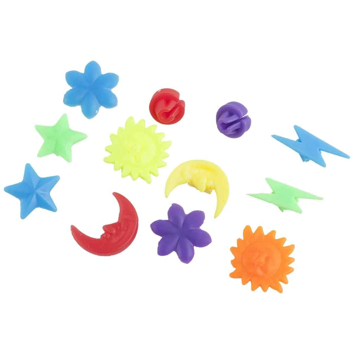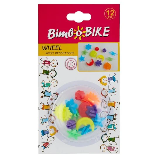 Velosipēda riteņa dekori piestiprināšanai pie spieķiem. Izgatavoti no kvalitatīvas krāsainas plastmasas, kas nodrošina izturību pret mehāniskiem bojājumiem, mitrumu un saules starojumu, nezaudējot krāsu. Dekorācijas ir viegli uzstādāmas, tās nenokrīt brauciena laikā un kalpo vairākas sezonas kā skaists papildinājums bērnu velosipēdam. Komplektā 12 gb.
