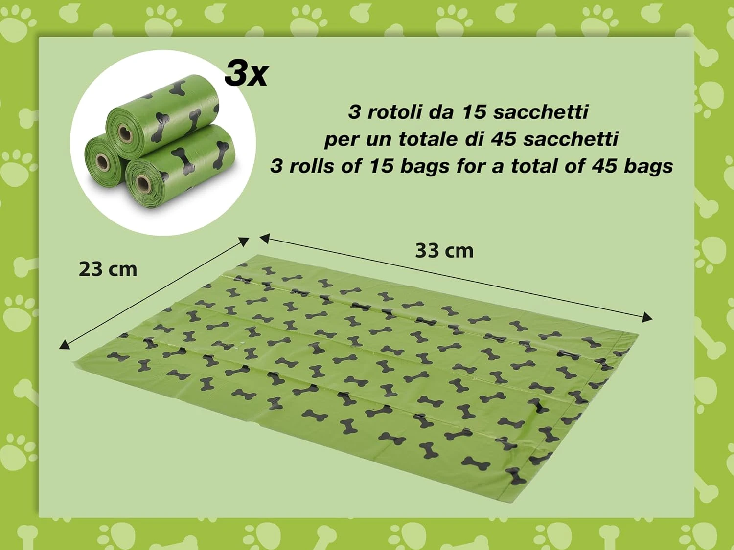 Saturs: Katrā iepakojumā ir 3 ruļļi suņu izkārnījumu maisiņu pa 15 maisiņiem katrā, kopā 45 zaļi maisiņi ar melnu kaulu apdruku. Uzglabāt bērniem nepieejamā vietā.