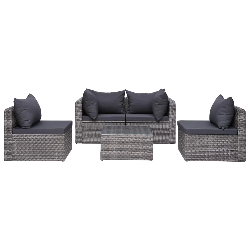 vidaXL 5-daļīgs dārza dīvāna komplekts ar matračiem, pelēks PE pinums