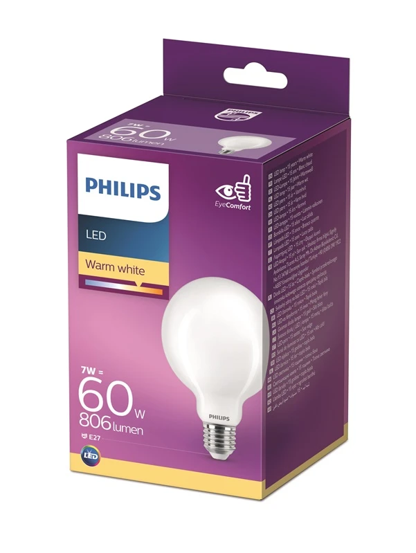 Preces tips- Spuldzes. Artikuls- 929002370801. Zīmols- Philips. Spuldzes tips- LED. Garums- 95 - 95mm. Platums- 95 - 95mm. Augstums- 140 - 140mm. Spriegums- 220 - 240V. Cokols- E27. Gaismas plūsma- 806 - 806lm. Spuldzes forma- Apaļa/burbulis. Gaismas krāsa- Silti balta. Krāsu temperatūra- 2700 - 2700°K. Virsmas/stikla tips- Matēts. Gaismas plūsmas regulēšana- Nē. Spuldzes formas apzīmējums- G93. Krāsu atveides indekss (CRI)- 80. Spuldzes efektivitāte- 115 lm/W. Energoefektivitātes klase- E. Enerģijas patēriņš. kWh/1000 h- 7. Vidējais darbības ilgums- 15000 h. Ar reflektoru- Nē. Bezvadu vadība (Wi-Fi)- Nē. Ar tālvadības pulti- Nē. Tālvadības funkcija- Nē. Papildus informācija- Ekvivalents 60 W standarta spuldzei. Obligātā garantija- 24 mēn. Garantija juridiskām personām- 12 mēn.