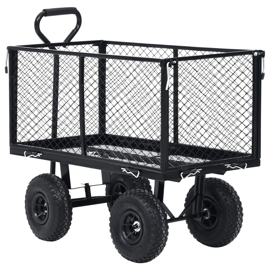 Dārza ratiņi ir izgatavoti no izturīga tērauda, tāpēc tie ir īpaši stabili un stipri. To maksimālā slogojamība ir 350 kg, un ar tiem var viegli pārvadāt ziedus, lapas, apaļkokus un citas lietas. Atveramajiem sānu paneļiem ir ātrās atlaišanas stiprinājumi, kas ļaus jums ērti iekraut kravu un to izņemt. Pateicoties lieljaudas pneimatiskajiem riteņiem, jūs varēsiet bez piepūles pārvietot ratiņus arī pa nelīdzenām virsmām. Polsterētais rokturis nodrošina stingru saķeri.