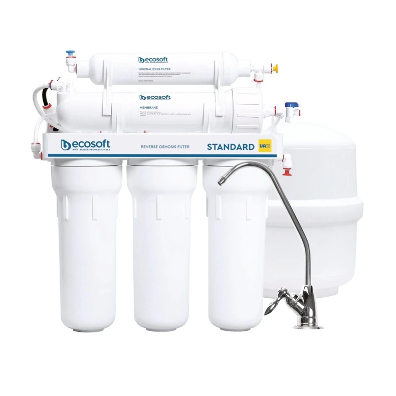 Zīmols- Ecosoft. Modelis- Standard. Pakāpju skaits- 5. Maksimālā veiktspēja, l/24h- 189. Padodamā ūdens spiediens- 3 - 6Bar. Filtrēšanas pakāpe- Piektais: mineralizācijas filtrs, Pirmā: Mehāniskās attīrīšanas 5 MKM kasete, Otrā: Granulēto kokosriekstu ogļu kasete, Trešā: Mehāniskās attīrīšanas 1 MKM kasete, Ceturtā: Membrāna. Komplekts- Reversās osmozes dzeramā ūdens filtrēšanas sistēma, hromēts krāns, plastmasas spiediena tvertne un tvertnes vārsts, ūdens filtra kārtridžu komplekts.. Obligātā garantija- 24 mēn. Garantija juridiskām personām- 12 mēn.