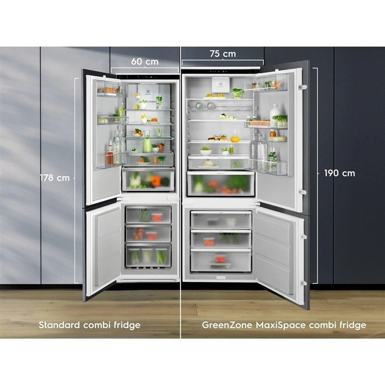Zīmols- Electrolux. Modelis- E7TNGE75S. Augstums- 188.4 cm. Platums- 69.6 cm. Dziļums- 54.9 cm. Svars- 80 kg. Krāsa- Balta. Ledusskapja veids- Saldētava apakšā. Energoefektivitātes klase- E. Gada enerģijas patēriņš- 247 kWh. Kopējais ledusskapja tilpums- 287 l. Kopējais saldētavas tilpums- 89 l. Trokšņa līmenis- 35 dB. Saldēšanas atvilktņu skaits- 3. Ledusskapja darba temperatūra- 2 - 8°C. Saldētavas darbības temperatūra- -24 - -15°C. Automātiskā atkausēšana- Jā. Saldēšanas sistēma saldētavā- No frost. Plauktu skaits- 3. Durvju atvēršanas virzienu maiņa- Jā. Ekrāns- Jā. Plauktu materiāls- Rūdītais stikls. Tuvu 0 °C temperatūras zona- Jā. Ātrā sasaldēšana- Jā. Saldēšanas jauda, kg/24h- 10.5. Apgaismojuma tips- Luna. Kompresoru skaits- 1. Termostats- Jā. Termostata tips- Elektronisks. Dārzeņu un augļu nodalījums- Jā. Drošības laiks strāvas pārrāvuma gadījumā- 15 h. Ūdens un ledus vienības- Nē. Vadība- Sensoru, Elektroniska. Papildus informācija- Pateicoties „MaxiSpace“, Jūs iegūstat par 45% lielāku ietilpību n