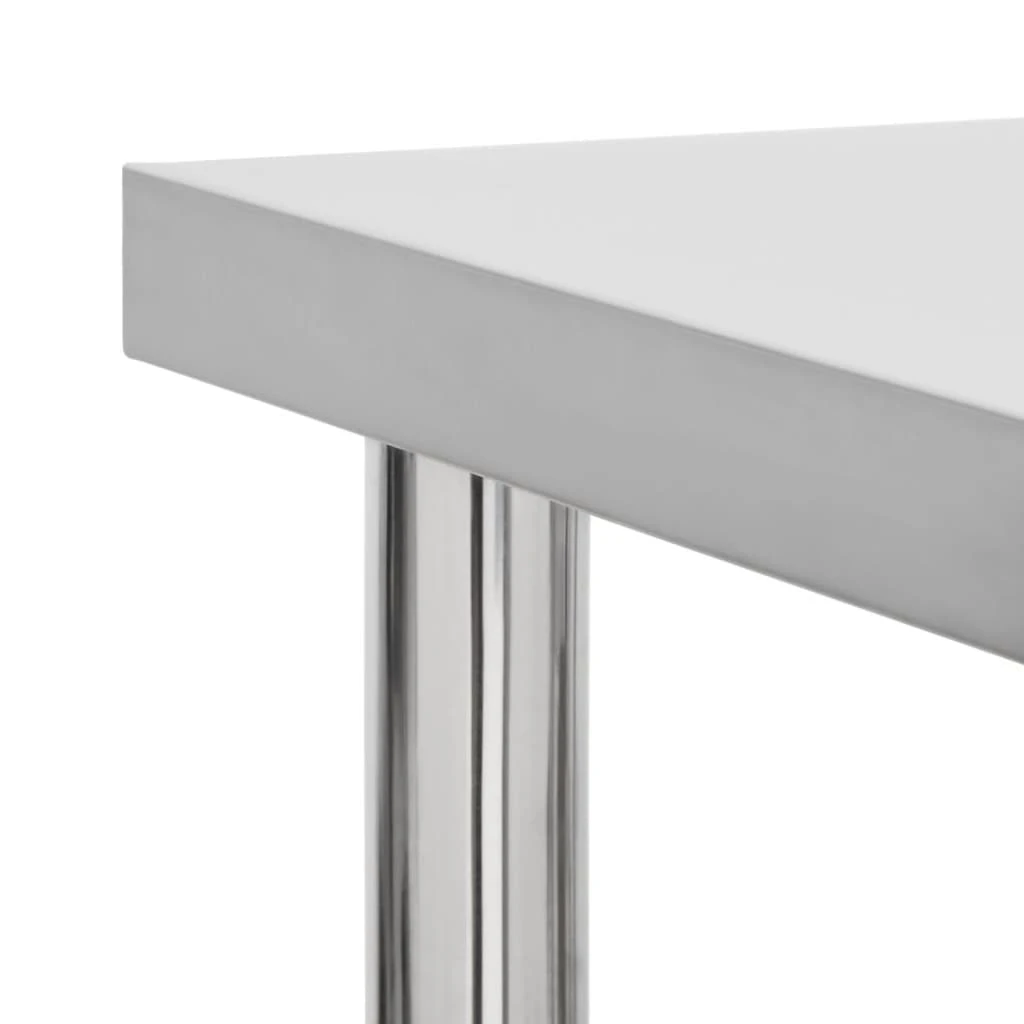 Šis darba galds ir izgatavots no nerūsējoša tērauda, tāpēc tas ir nenolietojams. Tā gludā virsma ir izturīga pret koroziju, un to ir viegli tīrīt. Galda apakšējā nodalījumā ir daudz vietas dažādu priekšmetu uzglabāšanai. Darba galdam ir 4 kustīgi ritentiņi, tāpēc jūs viegli varat pārvietot galdu. Diviem ritentiņiem ir bremzes, kas palīdzēs galdu novietot stabilā pozīcijā.