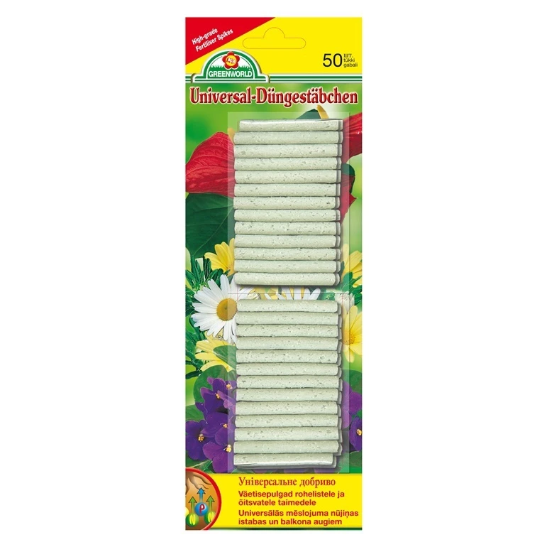 Ilgstošas iedarbības (līdz 3 mēnešiem) mēslojuma nūjiņas zaļajiem un ziedošajiem augiem. Šīs nūjiņas nodrošinās augus ar nepieciešamajām minerālvielām, stiprinās sakņu sistēmu un palīdzēs aizsargāt augu no slimībām. Veicina augšanu, piešķir lapām spilgti zaļu krāsas niansi, veicina bagātīgu ziedpumpuru veidošanos.