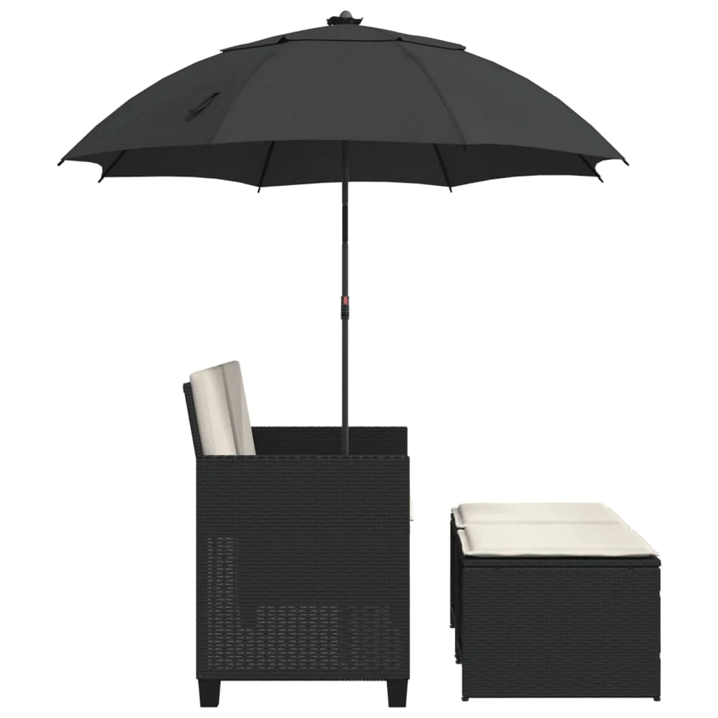 vidaXL divvietīgs dārza dīvāns ar saulessargu un soliņiem, melns, PE