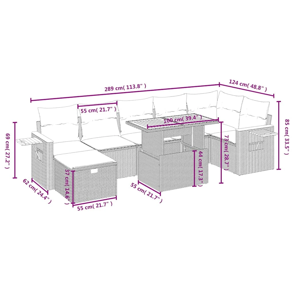 vidaXL 9-daļīgs dārza dīvānu komplekts, matrači, bēša PE rotangpalma
