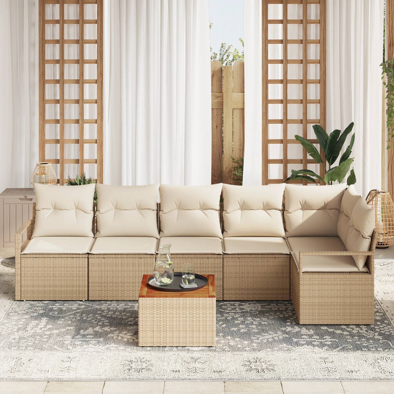 • Komplektā iekļautie elementi: Komplekts sastāv no trim centrālām sēdvietām, stūra sēdvietas, divām roku atbalsta sēdvietām un elegantā dārza galda. Katrs elements ir aprīkots ar masīvkoka akācijas virsmām un polietilēna rotangpalmas roku balstiem, kas nodrošina komfortu gan sēžot, gan pieņemot viesus. Aizmugures spilveni un putu pildītās sēdvietas nodrošina ērtu atbalstu ilgstošai lietošanai.