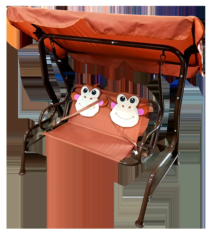Šūpuļkrēsls bērniem ar pērtiķīšu dizainu, jumtiņu un drošības jostām. Sēdvieta un jumtiņš izgatavoti no 210D poliestera, statīvs no krāsotām metāla caurulēm, cauruļu diametri 32 / 22 / 19 / 13 mm. Šūpuļkrēsla izmērs 115 x 75 x 110 cm.