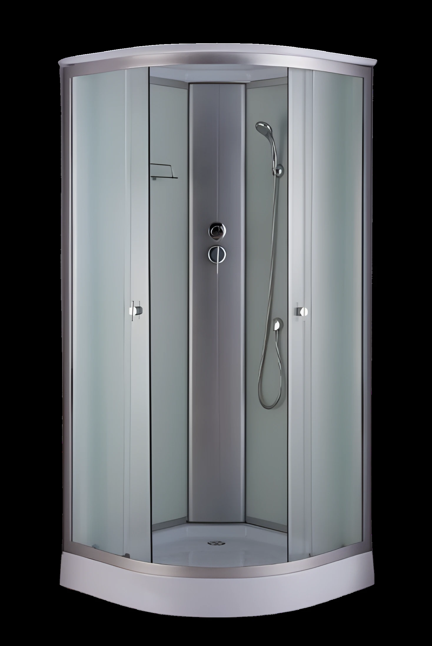 Pusapaļa dušas kabīne ar zemu akrila paliktni, alumīnija rāmi, divām bīdāmām stikla durvīm. Izmēri 90 x 90 x 215 cm.