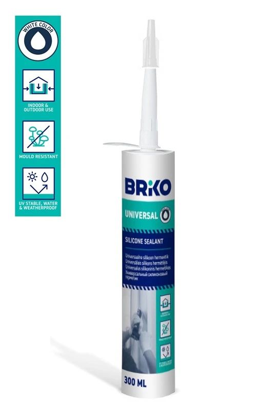 Zīmols- Briko. Kolekcija- –. Krāsa- Balta. Mērķis- izolācijai/hermetizēšanai. Tilpums- 0.3 l. Temperatūras izturība- -50 - +120°C. Izturīgs pret mitrumu- Nē. Izturīgs pret pelējumu- Nē. Lietošanas nosacījumi- Iekšējās telpas. Metāla apsmidzināšanai- Jā.